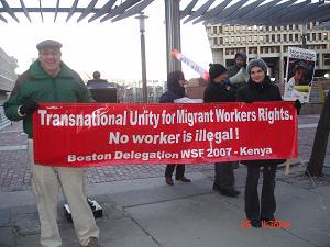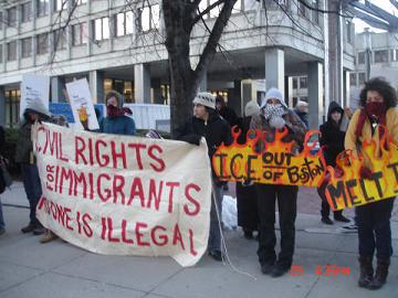NEWSProtest Against ICE Raids, An Act of Love in the Freezing Cold of BostonBoston, January 28, 2008. The Boston May Day Coalition called for a "speak-out against ICE raids on undocumented migrant workers", in the context of a week of transnational action ending January 26. The International Council of the World Social Forum decided that instead of convening its eighth World Forum this year (2008), it would conduct a global week of action. Considering the USA’s war against immigrant workers and particularly “undocumented” workers, The Boston May Day Coalition chose to respond to the vicious character of recent raids in the state of Massachusetts. The first massive raid was conducted almost a year ago (in March 2007) by the Immigration and Customs Enforcement (ICE) in New Bedford. More desolation and raids in the cities of Nantucket, Chelsea, East Boston, Revere, Somerville and most recently Milford followed this initial raid. The Boston May Day Coalition denounces what appears to be a media strategy to justify ICE raids as a search for “criminals”. The Boston May Day Coalition denounces and condemns all ICE raids against immigrants and calls upon people not to be deceived by this strategy. Thus, on Friday, January 25, nearly 60 people heeded the call to protest the repressive policies of the Bush administration against undocumented workers in the U.S. Given the weather conditions this effort can only be construed as an act of love, humanity and solidarity towards our fellow undocumented workers, who suffer military-style police repression. It was so cold that we were not visited as usual by U.S marshalls or Boston Police. But, there were the young members of the Boston Students for a Democratic Society, our dear friends in the struggle from the Boston Anti-Authoritarian Movement and the Industrial Workers of the World, members of the Martin Luther King Bolivarian Circle, and people who participated in previous Boston delegations to the World Social Forum, Mass. Global Action, Chelsea United Against the War, the Socialist Workers Party, the International Socialist Organization, and the Socialist Party. Also present were many independent migrant rights advocates. Special mention must be given to our friends from ROCA, a community youth organization based in Chelsea who attended the protest bringing copies of their latest contribution to the struggle for immigrant rights, a beautiful Spanish-English booklet called "Know Your Rights! How to Protect Yourself in Case of an Immigration Raid". This was an effort of their Immigrant and Refugee Initiative and the booklet is being distributed free to immigrants and immigrant rights advocates. As I painfully walked towards the subway station, with frozen feet and cramped legs, I thought that our presence there in the streets of Boston under the cold was definitely more than a political expression, an act of love. I also thought whether our undocumented migrant friends ever think about the people in the U.S. and around the world who are on their side, who appreciate them as fellow human beings. I wondered if they ever think about who are in the frontlines in defense of their rights, young anarchists, socialists, communists, and so many good people who stand up to their government in defiance of their repressive policies. As I made it to the subway station, it took me about 15 minutes to overcome my legs pain and be able to board a train to go back home. Recognizing that my health and age are starting to slow me down, I found solace and comfort in the presence of our young comrades and found hope and strength to continue the struggle. Thank you to all who attended this rally, our small contribution to the transnational struggle for a better world. Another world is possible! Submitted by Sergio Reyes Boston May Day Coalition Pictures by Diego Peña |