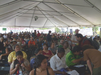 During the afternoon the Assembly of Social Movements met, usually the most massive meeting during the forum. This event is like all the others not really an official meeting of the Forum itself. It is always hard to tell who organizes it, but in general those who started the process continue to control the process. We presented our resolution to be included in the final statement of the Assembly. We were not select to present our proposal because the organizers picked only two presenters within this theme. As I consulted why they had "rejected" our proposal, they said, "they didn't but only selected two and no more." Curiously, as you have already seen our proposal was critical of the process of the various forums on this area and had suggestions to improve the process. We had a similar experience in the World Social Forum in Nairobi.