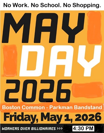 [ + ] ![]() Mobilize Tuesday, May 1 Rally on the Boston Common, Parkman Bandstand @ 5:00 PM Followed by a 6:30 March to Copley Square Resist Deportations! Immediate Permanent Legal Residence for All Undocumented Migrants! Permanent Residence for All DACA and TPS Recipients! Driver’s Licenses for All Undocumented MA Residents! $15 Minimum Wage! Stop Racist Attacks! End Mass Incarceration! Equal Pay for Equal Work! Full Union Rights for All Workers! Free Day Care for All Workers! Full Labor Rights for So Called “Independent Contractors”! End Military Intervention, Bring All US Troops Home Now! Defend Transgender Rights! Unions for All Workers! Organize the Unorganized! Workers’ Control in the Workplace! Jobs, Pensions, Healthcare, and Education for All Workers and Youth! The government in Washington and the billionaire class are leading a generalized assault on our lives, rights, and living conditions. The wealth gap today continues to grow. From the racist attacks on Muslims, Migrants, and African-Americans to attacks on healthcare, women, and LGBT folks, and from attacks on our environment and education, to perpetual wars, working people are under fire. The leading edge of this assault today is the stepped up attacks against migrants. Deportations are accelerating. As US wars have created massive debt and refugees internationally, the consequences of corporate greed at home have created refugees within our own borders. The war on the poor continues. Student debt stands at over a trillion dollars! The recent tax cuts for the rich will be at the expense of our living standards. They will be going after affordable housing, Medicare, Medicaid, and Social Security. Millions of youth and decent hard working people are under attack! Claiming that human caused climate change is a "hoax", the Trump Administration pulled out of the Paris Climate Accord. The falsehood of this claim was yet again demonstrated by the horrendous hurricanes that devastated the Gulf Coast and Caribbean. Enough is enough! An injury to one is an injury to all! Let us stand together and build a united, fighting movement. Please join us on May Day where our program will address: Migration, Labor Rights, Systemic Oppression, Threats to Human Survival, and the role of capitalism, US imperialism, and war in the current crisis. Cosponsors: Anarchist Black Cross ANSWER - Boston Bay State Red Sentinels #BecomeUngovernable Bishop Filipe C. Teixeira- Immigration Pastoral Center, Brockton Boston Education Justice Alliance Boston Labor Solidarity Committee Boston May Day Coalition Boston Socialist Alternative Boston Socialist Party Boston Teachers Union Community Church of Boston Cosecha Boston Cosecha Merrimack Valley CPUSA Boston Emmanuel Church in the City of Boston Food for Activists Greater Boston Chapter: Green-Rainbow Party Party for Socialism and Liberation - Boston Refuse Fascism, Metro Boston UAW Local 1596 Veterans For Peace - Boston, Smedley D. Butler Brigade Watertown Citizens for Peace, Justice and the Environment Other May 1st actions: Everett - Main Rally 5:30pm Glendale Park https://www.facebook.com/m1coalition/ E. Boston - gather and march 4:00pm Liberty Plaza Chelsea - gather and march 4:30pm City Hall Worcester - 4:45- 6:30 PM, 145 Front Street https://www.facebook.com/events/168239757215470/ [ + ] Mobilize Saturday, December 2